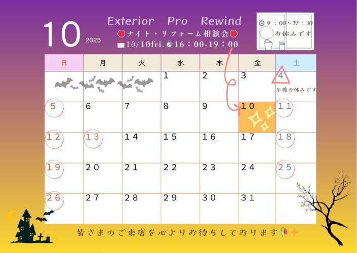 秋晴れが気持ちよい季節になりました。10月の営業日をカレンダーでご案内いたしますので、ぜひご参考ください。