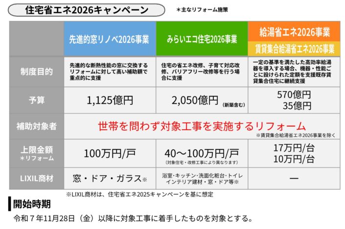 国の省エネ政策として毎年実施されている「住宅省エネキャンペーン」が、2026年度も継続されることが決まりました。2050年カーボンニュートラルの実現に向けて、断熱性能の向上や高効率設備の導入を後押しする大規模な補助制度です。今回も、窓リフォーム(断熱窓交換・内窓・ガラス交換)や玄関ドア交換など、マド本舗で人気の工事がしっかり対象です!